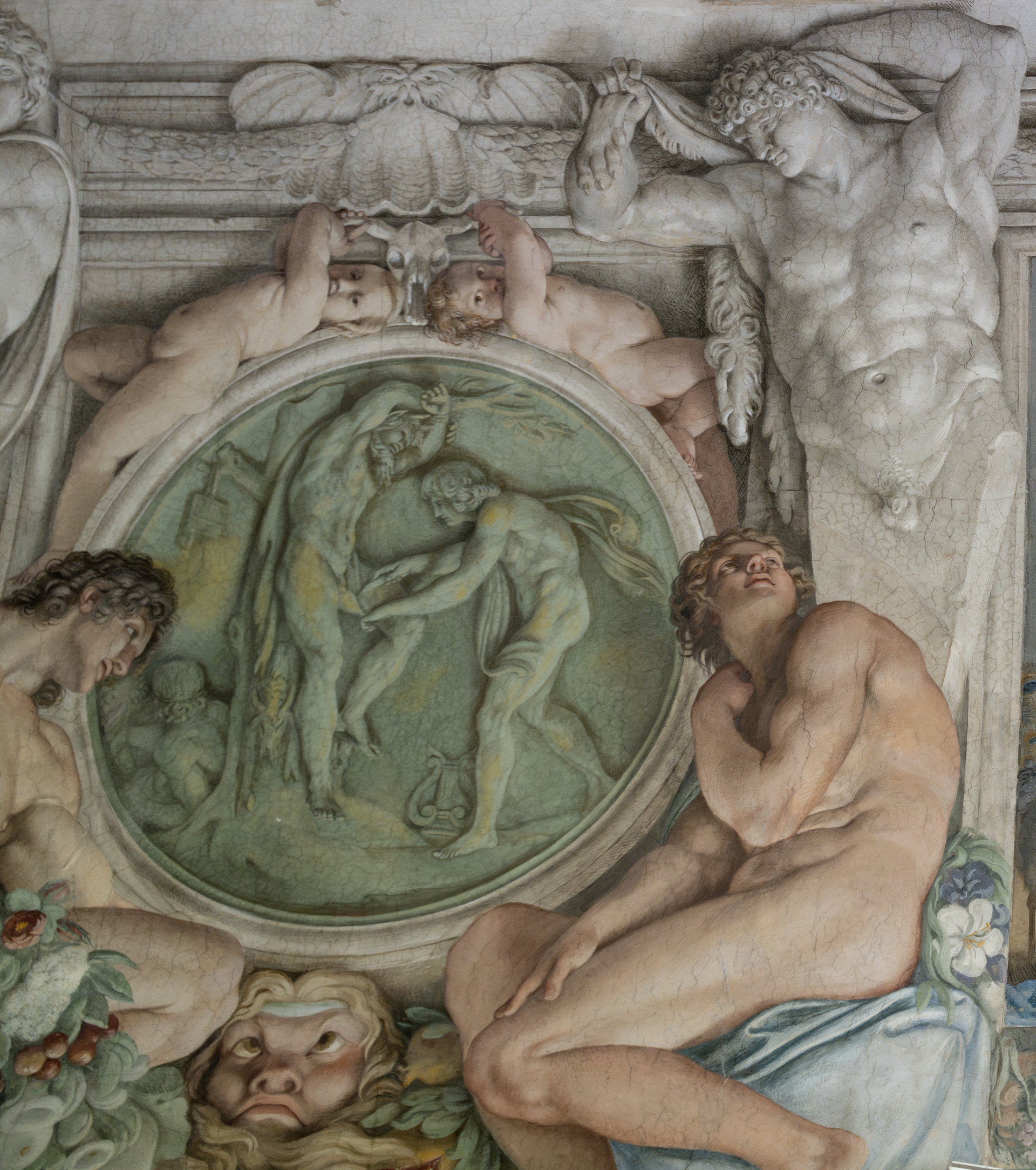 L’étude révèle le travail minutieux et les hésitations de l’artiste. La jambe droite, à peine ébauchée, changera de position dans la fresque. Quant au bras gauche, il est dessiné à deux reprises : l'un masque partiellement le visage ; l'autre apparaît plus ouvert et sera choisi pour la composition finale. Ces variations témoignent du processus de recherche qui précède l’exécution du plafond.